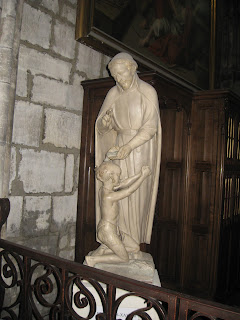 | This is in the Portal of Mary. The 3rd of these statues is St. Denis. He is holding his head in his arms. The story goes that Denis, then bishop of Paris, was beheaded by the Romans as a warning to those forsaking Roman gods. With the help of two angels, he just picked up his head and walked off to his own burial place, thus defying the Romans and convincing the Parisians. Catholicism gained ground, and soon a church replaced the pagan temple. (Steves) |